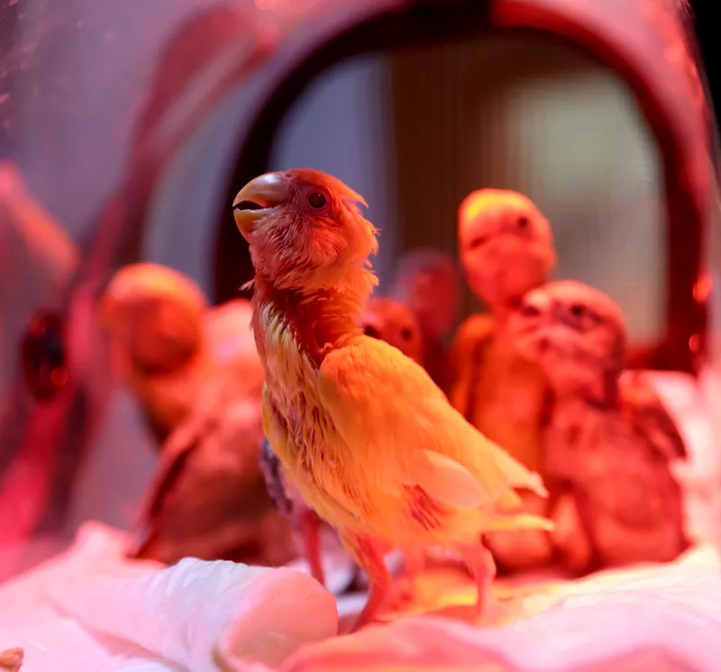 Uygun ışık ve sıcaklık değerlerinde tutulan ve 5 saatte bir şırınga aracılığıyla özel mamalarla beslenen papağan yavrularının tüyleri çıkmaya başladı.