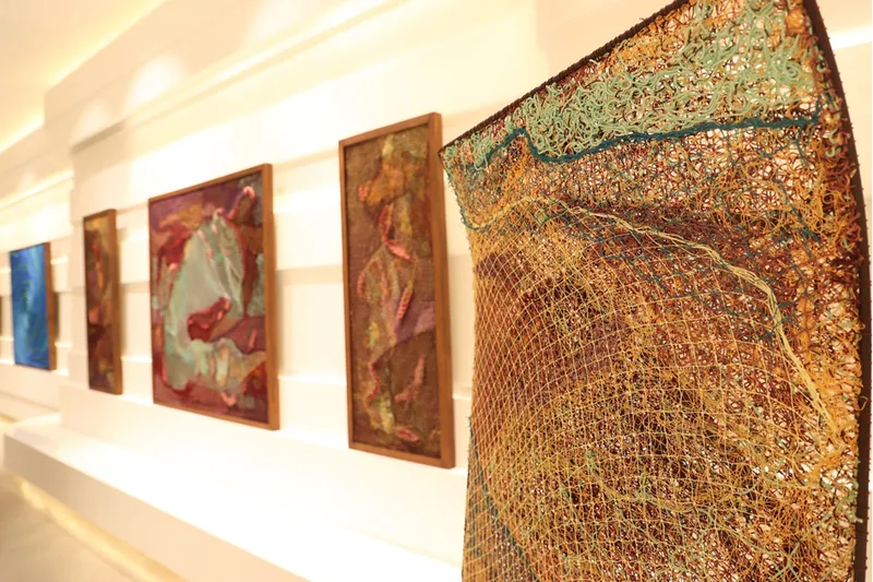 Özümerzifon, eserlerinin ana malzemesi olan balık ağlarını, "ağlıboya" olarak nitelendirdiği üç boyutlu tablolar ve yumuşak heykellere dönüştürüyor. Çevre, geri dönüşüm ve iklim değişikliği gibi konularda toplumsal farkındalığı da destekleyen sergi, 14 Şubat'a kadar ziyarete açık olacak.