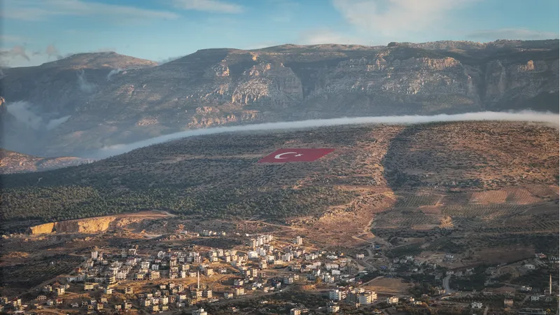 MERSİN (AA) - Mersin'in Mut ilçesinde 22 dönümlük araziye işlenen dev Türk bayrağı, sisle güzel görüntü oluşturdu.