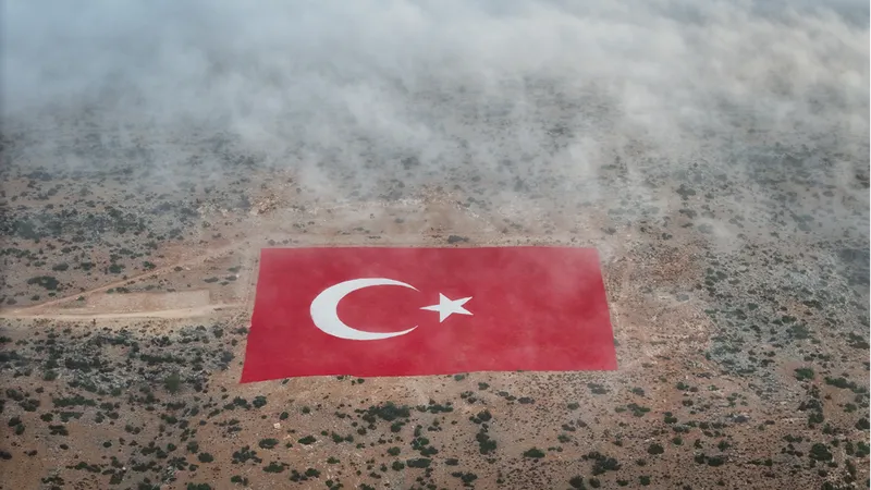 Sisin kapladığı dağlardaki 21 bin 600 metrekarelik Türk bayrağı sis altında dronla görüntülendi.