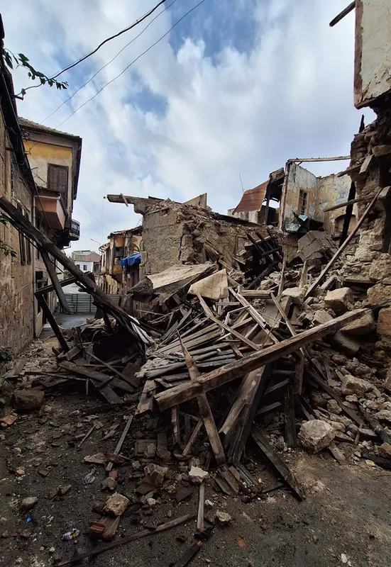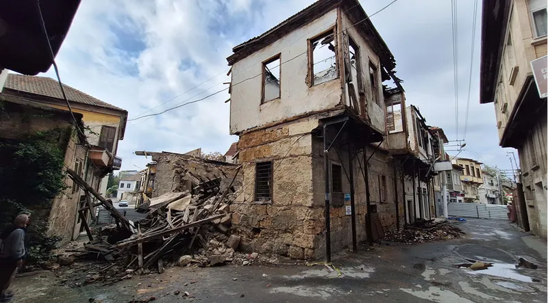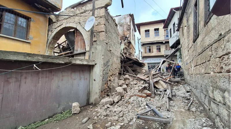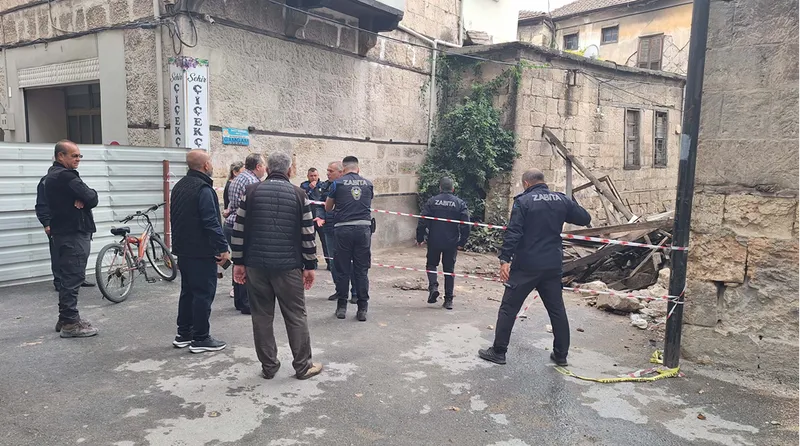 Metruk binadan kopan parçalar, daha önce belediye ekiplerince alınan tedbirler kapsamında kapatılan sokağa devrildi.