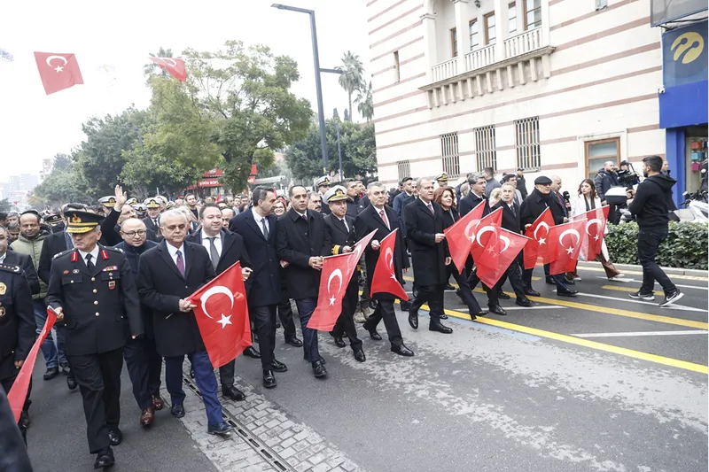 Cumhurbaşkanı Recep Tayyip Erdoğan'ın kutlama mesajının okunduğu törende, Vali Atilla Toros, Tuğamiral Özgür Erken ve Büyükşehir Belediye Başkanı Vahap Seçer araca binip alandaki katılımcıları selamladı, kentin düşman işgalinden kurtuluşunun yıl dönümünü kutladı.