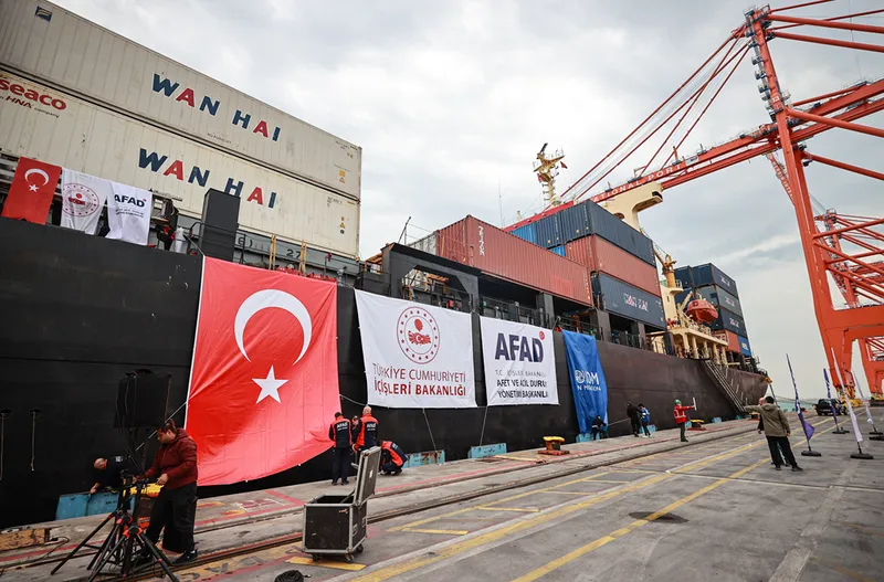 Bu kapsamda AFAD öncülüğünde temin edilen 10 bin 80 çadır, rıhtımdaki "Nz Ningbo" adlı gemiye yüklendi.