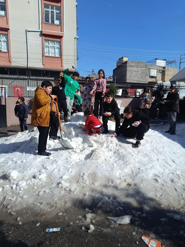 Adana'da çocuklar kamyonlarla getirilen karla eğlendi