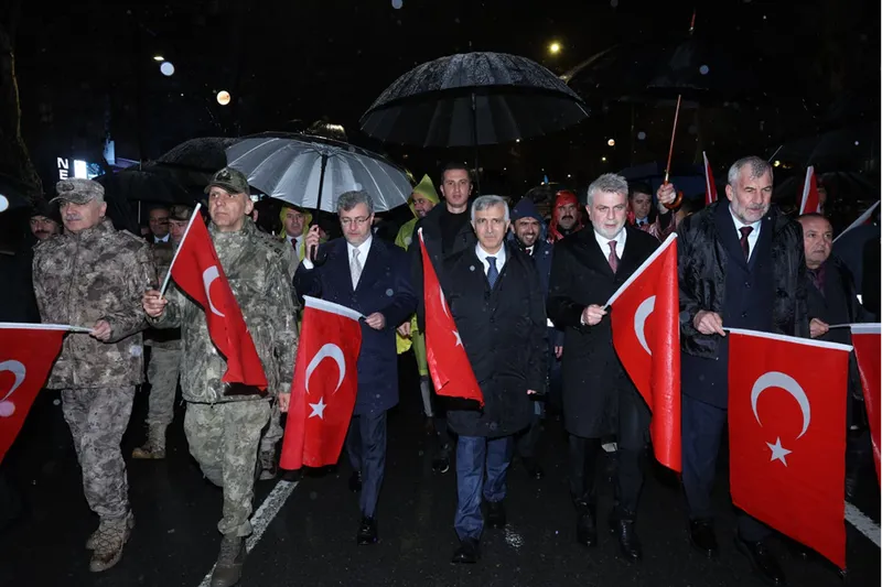 Valilik ve Büyükşehir Belediyesi öncülüğünde gerçekleştirilen program kapsamında 12 Şubat Parkı'nda toplanan vatandaşlar, sağanak yağış altında ellerinde Türk bayraklarıyla Necip Fazıl Kısakürek Kültür Merkezi'ne kadar yürüdü.