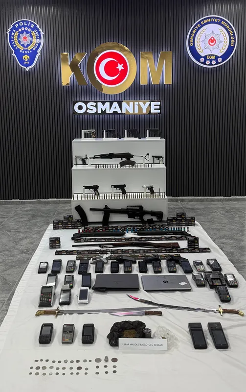 Osmaniye, İstanbul, İzmir, Hatay, Kahramanmaraş ile Şanlıurfa'daki ev ve iş yerlerine düzenlenen operasyonda 9 tabanca, 4 av tüfeği, 1 otomatik piyade tüfeği, bir miktar uyuşturucu ile POS cihazı ele geçirildi.
