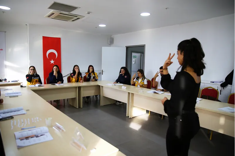 Mesai saatleri dışında düzenlenen kursa katılan çalışanlara, paramedik ve acil tıp teknisyenlerinden oluşan eğitmenler tarafından işitme engellilerin günlük hayatta sık kullandığı işaretler ve anlayabilecekleri tıbbi terimler öğretiliyor.