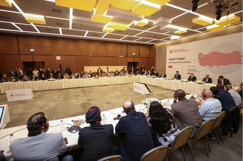 Kahramanmaraş merkezli 6 Şubat 2023'teki depremlerden etkilenen 11 ilde başlatılan "Asrın İnşası"ndaki çalışmalara ilişkin bilgilendirmede bulunan Kurum, Hatay'ın asrın felaketindeki yıkımın ve inşasındaki kararlılığın sembolü olduğunu söyledi.